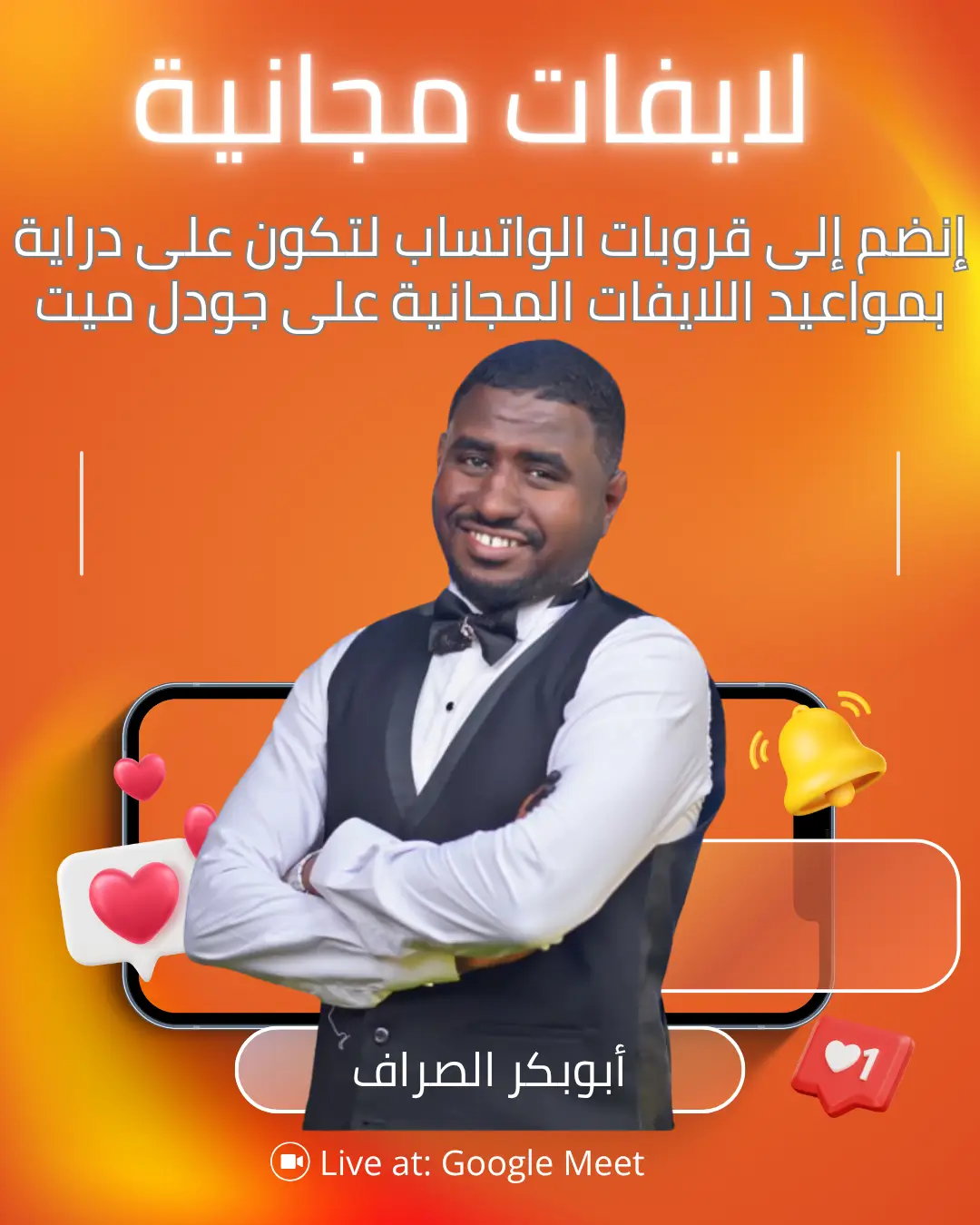 أحاول ان أتواصل معكم كل يوم سبت التاسعة مساءاً بتوقيت السعودية على جوجل ميت ، إنضم إلى قروبات الواتساب لمعرفة المواعيد القادمة