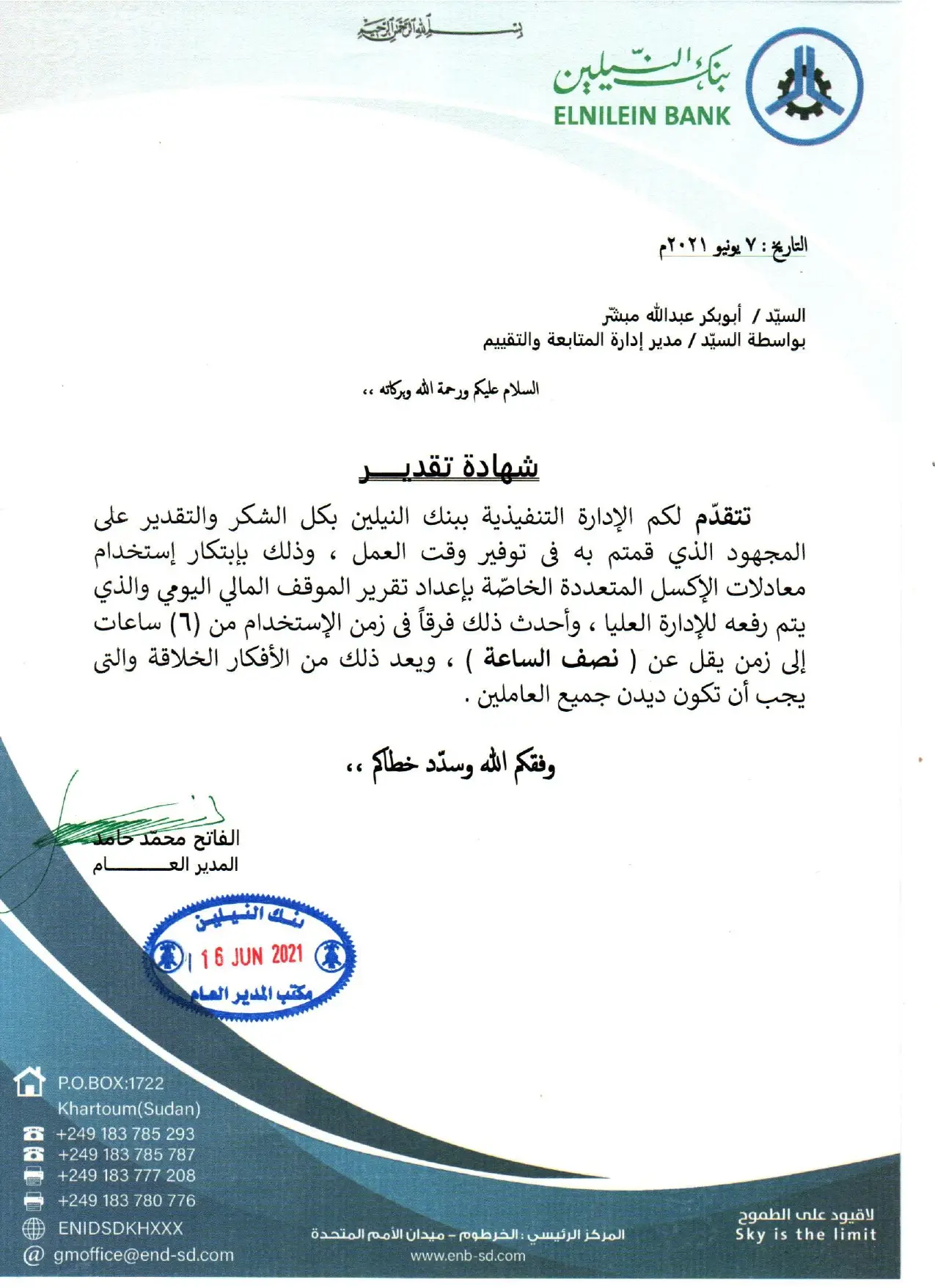 شهادة من مدير عام بنك النيلين في السودان ، نسبة لتقليل عدد ساعات العمل في أحد التقارير التي ترفع للإدارة العليا كل صباح من أكثر من 6 ساعات إلى أقل من نصف ساعة .