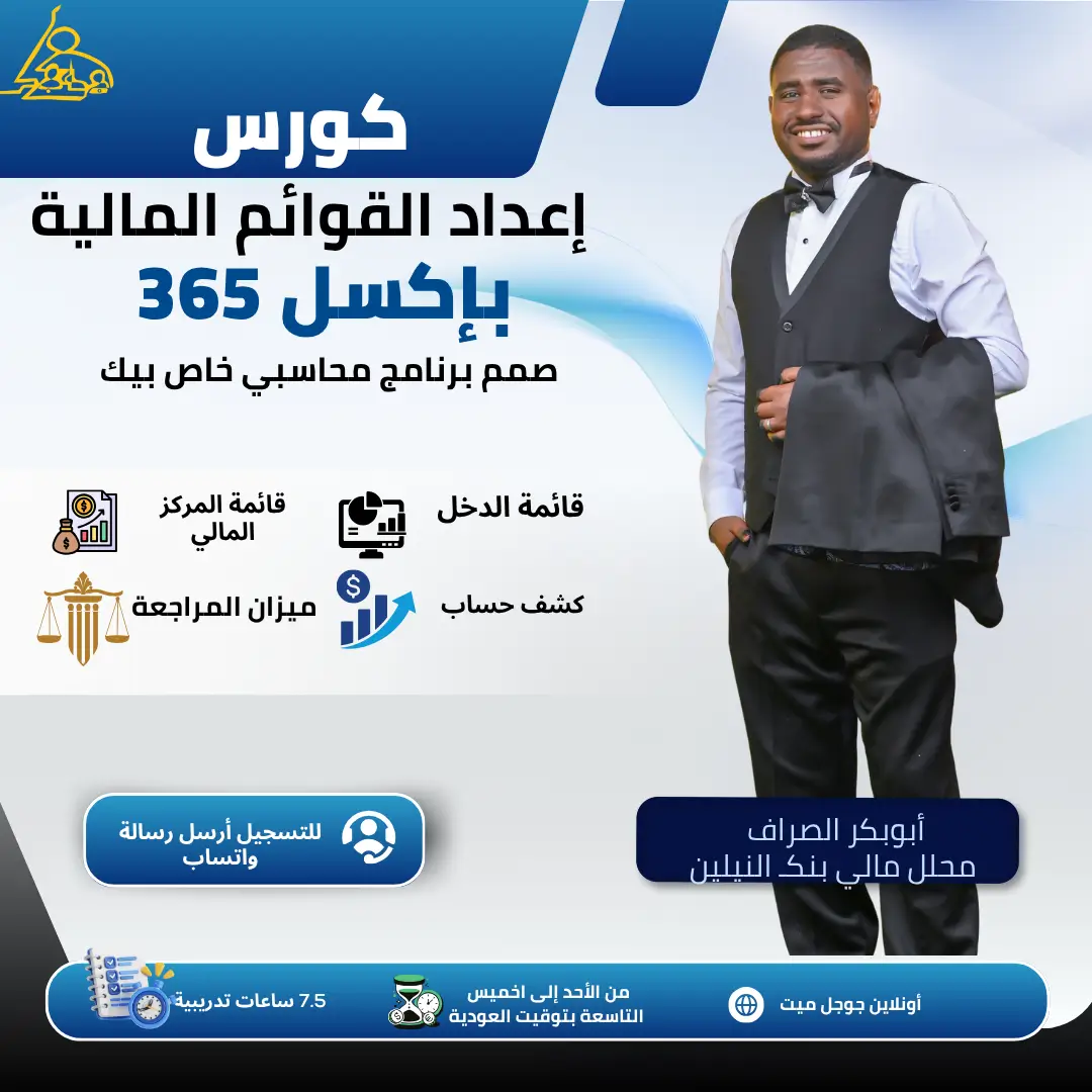 يهدف الكورس لتمكين المتدرب من القدرة على تصميم برنامج محاسبي بالإكسل خلال 5 أيام تدريبية – يبدأ الكورس كل إسبوع من الأحد حتى الخميس من الساعة التاسعة مساءاً حتى العاشرة و النصف مساءً و سنقوم بإعداد القوائم الآتية